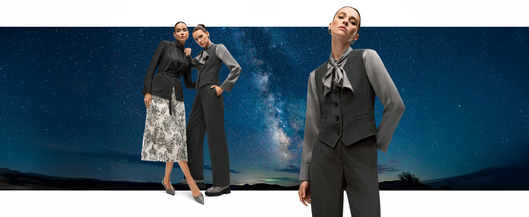 Tailoring within the collection blends classic elegance with modern silhouettes. Mélange fabrics in stone and anthracite appear across single-button blazers with waist belts, waistcoats, and both feminine and relaxed pant shapes. Salt-and-pepper weaves with fine mini-sequins elevate boyfriend blazers with peaked lapels, paired with complementary pant styles. These pieces work seamlessly for customers searching for tailored blazers and designer workwear that transitions effortlessly from office to evening.