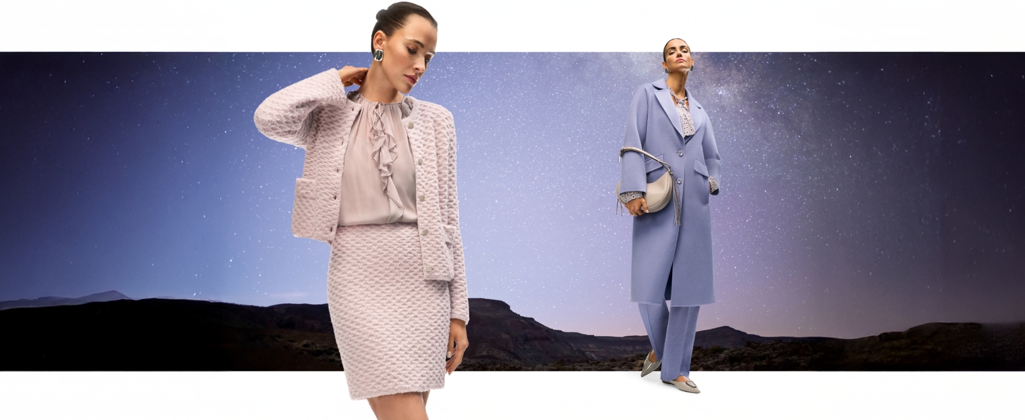 Rich textures bring warmth and versatility: crushed satin, mini herringbone, jersey jacquard, and cosy knits in multicolour yarns and cashmere blends. Romantic outerwear - from short faux-fur jackets to double-face coats - pairs perfectly with mid-blue and two-tone denim.