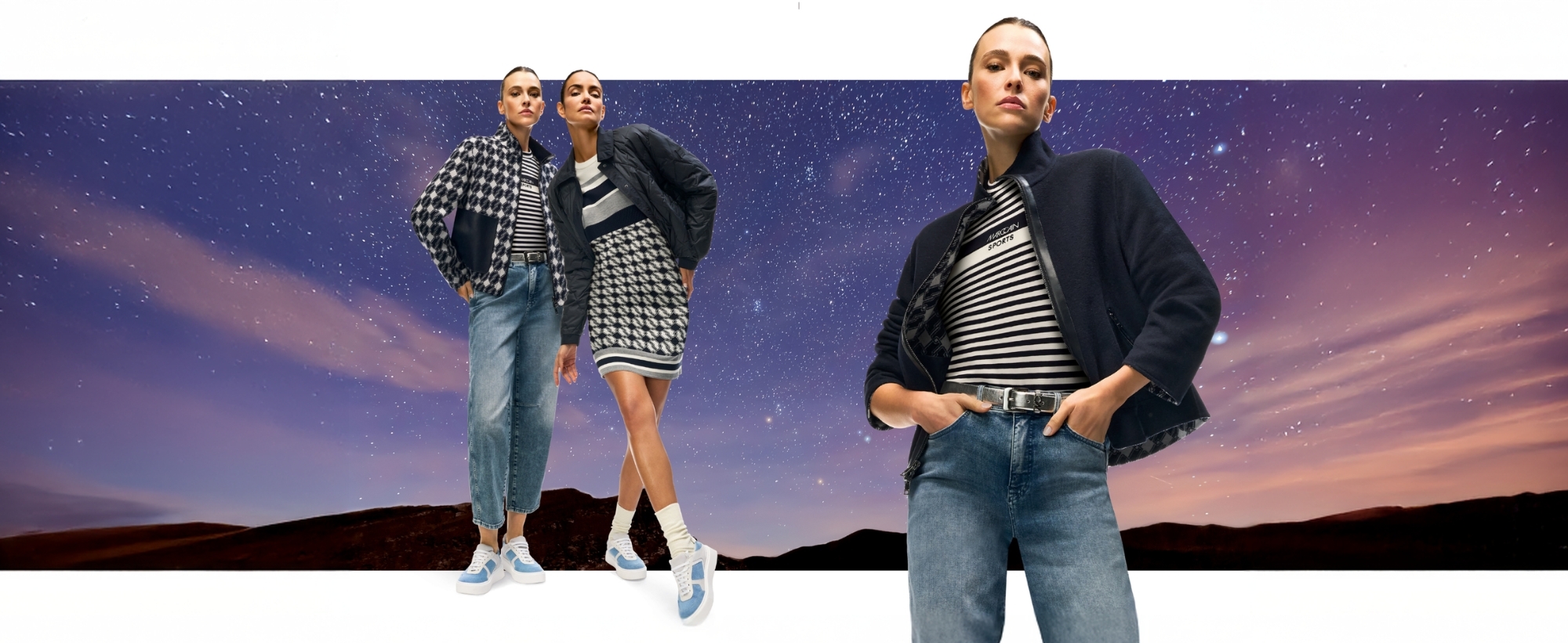 Classic shades of navy, off-white, and grey melange keep the look effortlessly polished, while stripes and block patterns lend a sporty twist. Key highlights include a wide-cut peacoat and a reversible double-face jacket in logo jacquard — outerwear that defines elevated everyday dressing.